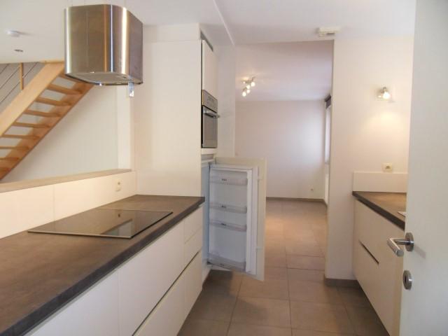 Ruim, energiezuinig DUPLEXAPPARTEMENT van 149 m² bestaande uit: Inkom met vestiaire-kast, apart wc met lavabo, grote living met open volledig ingerichte keuken, berging/wasplaats, ruim terras (zuid); verdieping: nachthal, volledig ingerichte badkamer (ligbad en douche, dubbele lavabo, hangtoilet), uittrekbare trap vanaf de nachthall naar grote bergzolder. Cv aardgas, waterverzachter. Regenwater is aangesloten op de wc's. Autostaanplaats achter het gebouw.