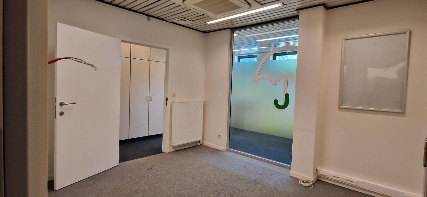 Ontvangstruimte, kantoorruimtes opgedeeld in verschillende compartimenten. Sanitair.