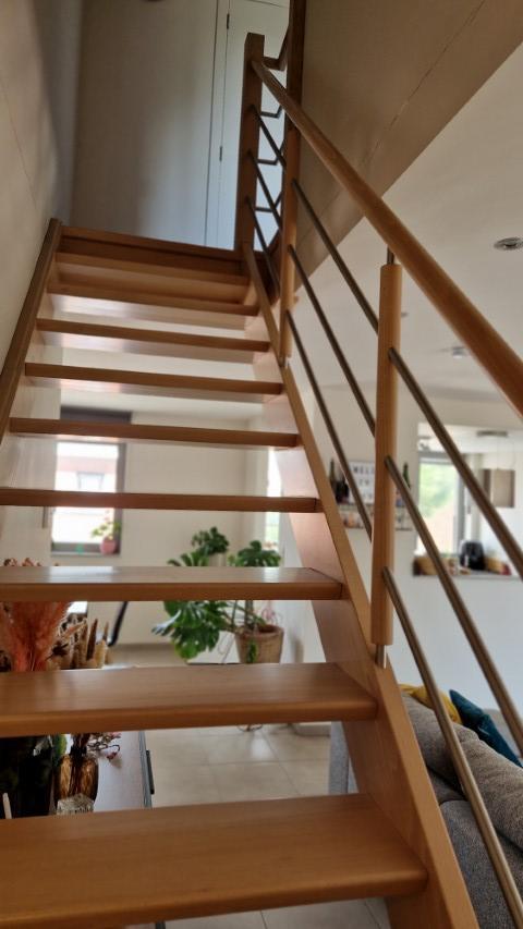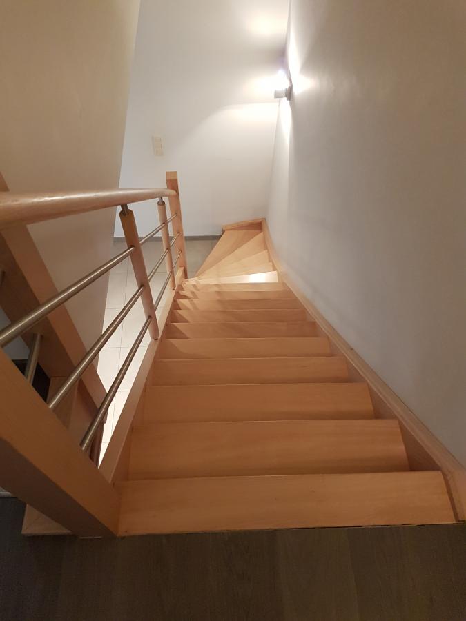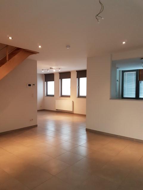 Ruim, energiezuinig DUPLEXAPPARTEMENT van 149 m² bestaande uit: Inkom met vestiaire-kast, apart wc met lavabo, grote living met open volledig ingerichte keuken, berging/wasplaats, ruim terras (zuid); verdieping: nachthal, volledig ingerichte badkamer (ligbad en douche, dubbele lavabo, hangtoilet), uittrekbare trap vanaf de nachthall naar grote bergzolder. Cv aardgas, waterverzachter. Regenwater is aangesloten op de wc's. Autostaanplaats achter het gebouw.