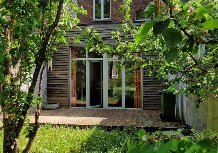 Gerenoveerde EENGEZINSWONING, gesloten beb. op 2 are 55 ca met tuin (zuid) en parking 2 wagens (garage mits vergunning mogelijk).